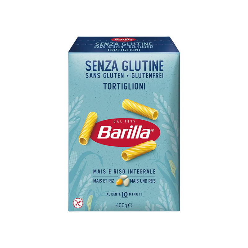 Pasta senza glutine, formato tortiglioni tempo di cottura 10 minuti.