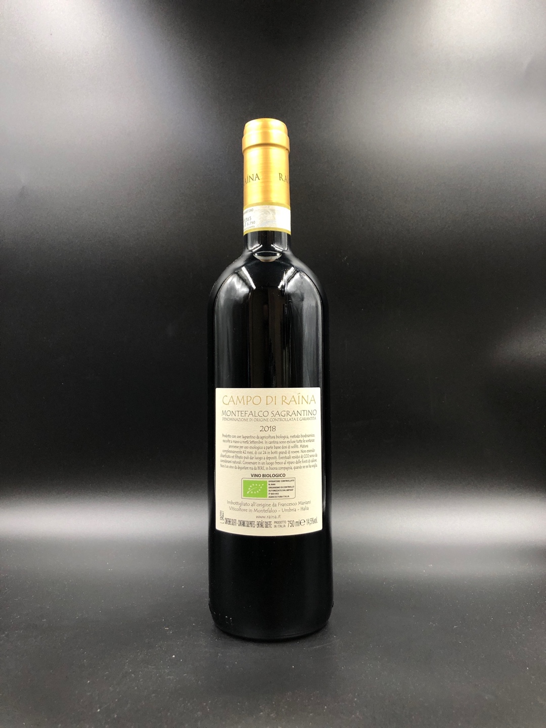 Il rosso Campo di Raìna è ottenuto a partire da uve Sagrantino. Le vigne, coltivate seguendo i precetti della biodinamica, sono site a circa 250-300 metri d’altitudine, con una densità di circa 5700 ceppi per ettaro. Le rese estremamente contenute e la successiva vendemmia manuale, sono solo una parte del lavoro di Francesco, votato al minor interventismo possibile. La fermentazione avviene spontaneamente in contenitori di acciaio con 15 giorni di macerazione sulle bucce. L’affinamento avviene in botti grandi di rovere per 24 mesi e per altri 12 in acciaio. Altri 12 mesi in bottiglia prima della messa in commercio. Colore rosso rubino molto intenso. Al naso è profondo, intenso e complesso, con note di erbe balsamiche, amarene, humus, fiori secchi e spezie dolci. Al palato è robusto, concentrato e profondo, di grande struttura e dai solidi tannini.