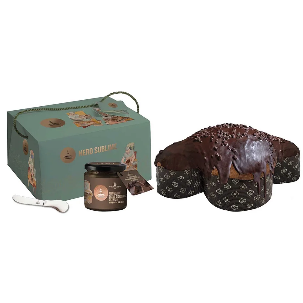 La confezione contiene: il panettone, un vasetto di crema al cioccolato di Sicilia e uno spalmino.