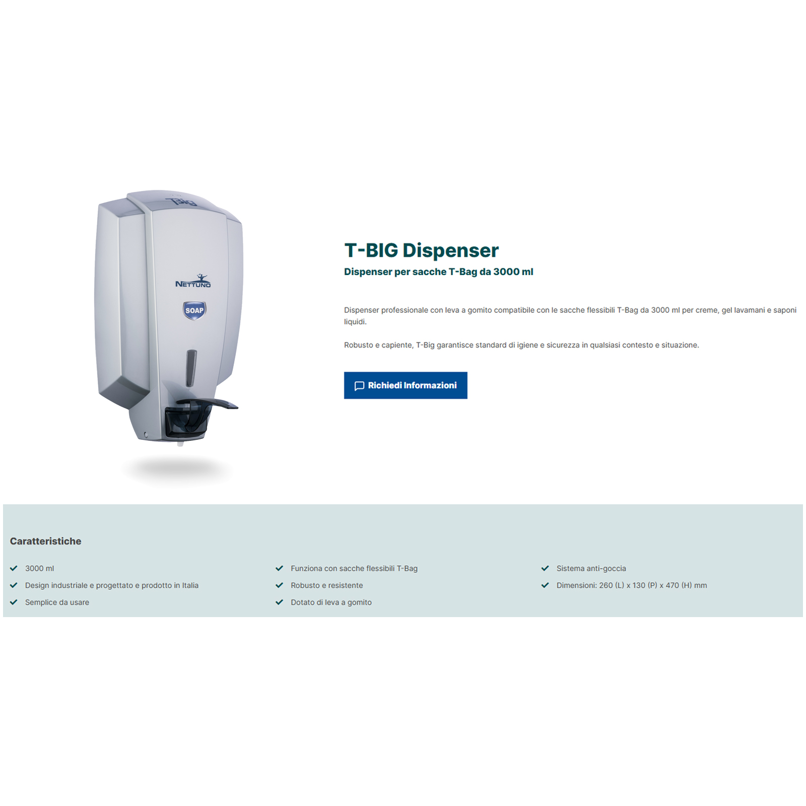 Dispenser professionale compatibile con le sacche flessibili Nettuno T-Bag da 3000 ml specifico per Saponi Liquidi Lavamani.