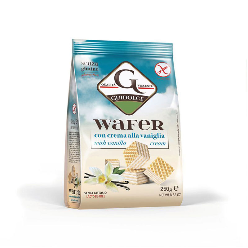 Wafers farciti con crema alla vaniglia (crema 75%) senza glutine. 3 cialde di wafer con 2 strati di farcitura alla vaniglia. Il prodotto è formulato specificatamente per consumatori celiaci ed è privo di lattosio; non ci sono comunque prescrizioni al consumo da parte del consumatore non sensibile.