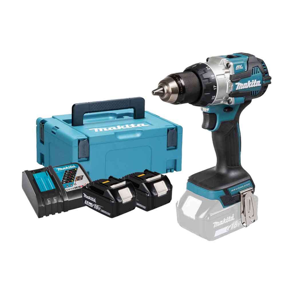 Makita DHP489RTJ include 2 batterie 18V 5,0Ah, carica batterie singolo DC18RC, gancio cintura, inserto doppio , preformato e valigetta Makpac tipo 2.