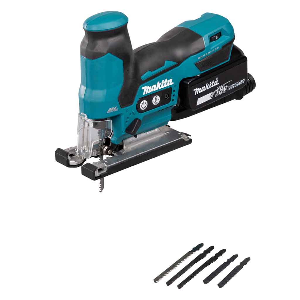 Makita DJV185RTJ include due batterie da 5,0Ah BL1850B, caricabatterie DC18RC, manicotto per aspirazione, protezione per base, protezione per schegge, 3 lame, chiavi di servizio, preformato e valigia Makpac tipo 3.
