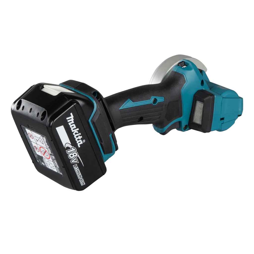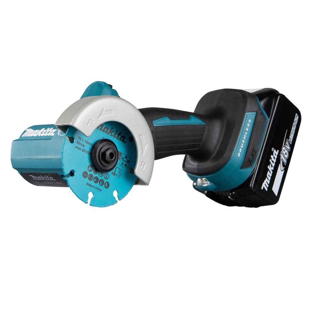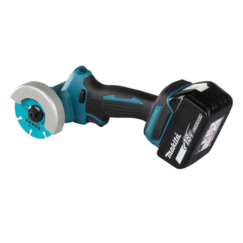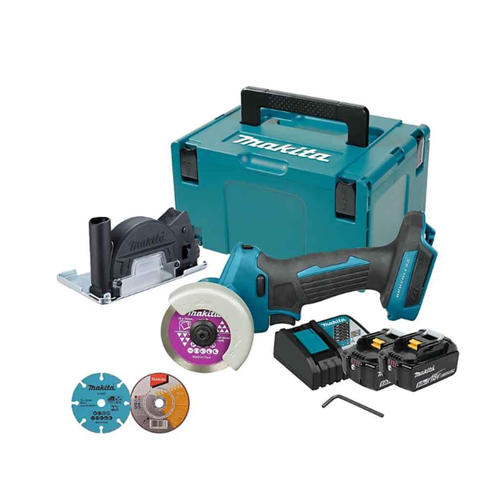 Makita DMC300RTJ include 2 batterie 18V 5,0Ah, carica batteria rapido singolo 18V, disco da taglio carburo di tungsteno, disco diamantato per piastrelle, disco da taglio sottile abrasivo, cuffia per aspirazione polveri e valigia Makpac tipo 2 per il trasporto.