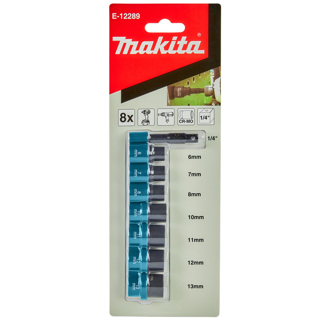 Il set bussole Makita E-12289 è composto da 8 pezzi delle misure più comuni da 1/4″ con un’eccellente durata grazie al loro rivestimento antiruggine.