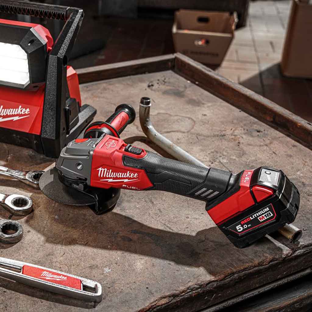 La Smerigliatrice angolare Milwaukee M18 FSAG125XB-0X è in grado di fornire prestazioni pari a 1.200 W con un corpo macchina dalle dimensioni ridotte e impugnatura ergonomica che lo rende molto maneggevole. La Smerigliatrice angolare M18 FSAG125XB-0X è dotata dell’impugnatura laterale antivibrazioni AVS e del sistema di sicurezza RAPIDSTOP™ in grado di frenare il disco in meno di 2 secondi con la protezione contro il riavvio accidentale. Il Sistema FIXTEC™ è studiato per la sostituzione del disco senza attrezzi e la calotta a sgancio rapido permette una massima capacità di taglio e rapida regolazione inoltre per proteggere il motore dalle polveri abrasive monta delle griglie rimovibili.
