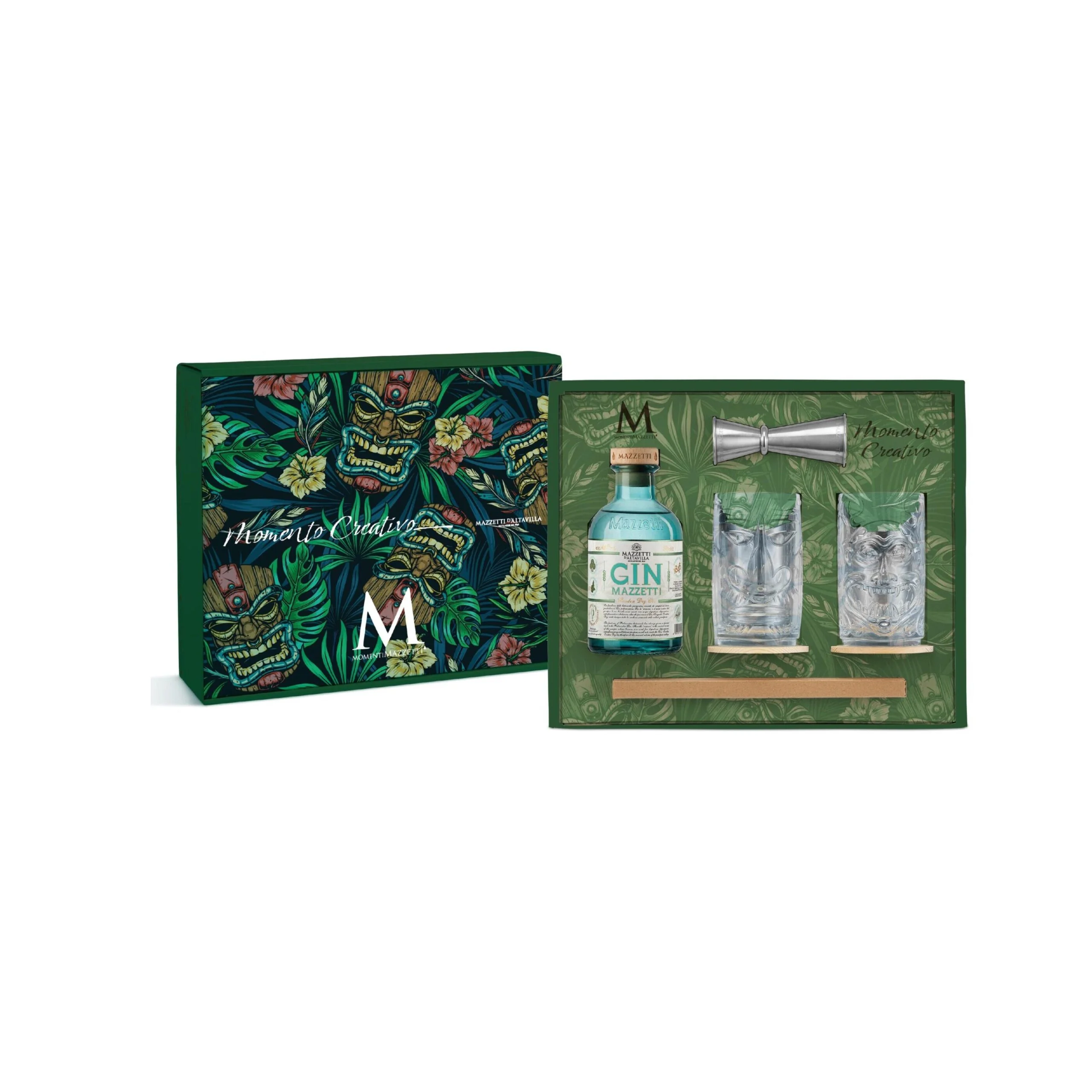 Momento Creativo Mazzetti d’Altavilla, la nuova confezione regalo composta dall’iconico Gin Mazzetti, i due iconici bicchieri Tumbler “Tiki”, il Jigger professionale in acciaio 30/50ml e il set da 8 cannucce in acciaio.