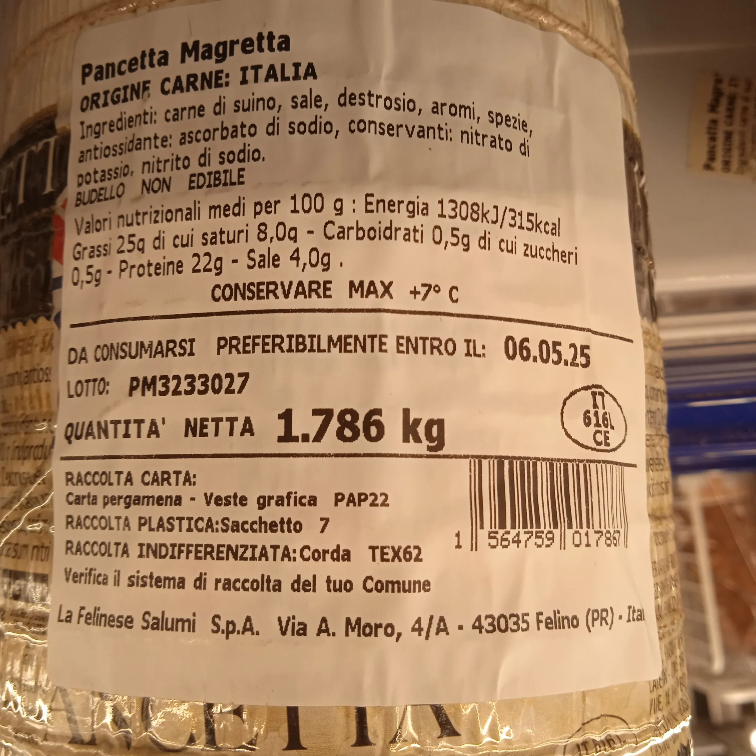 Pancetta Magretta Salumificio LA FELINESE 1.7kg c.a.