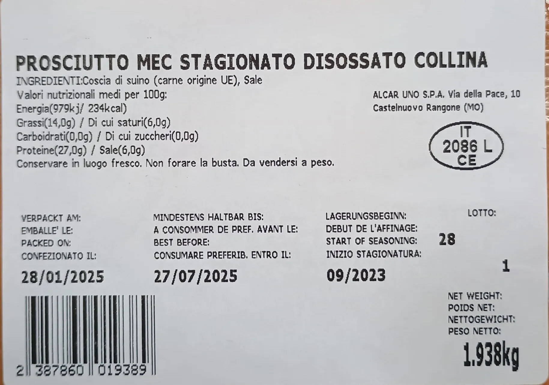 Prosciutto crudo Stagionato MEC 2kg c.a.