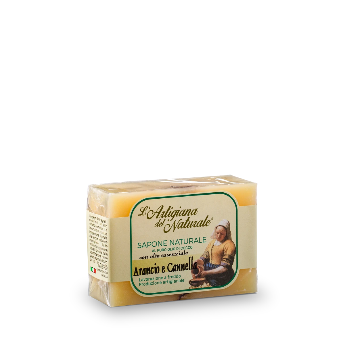 Sapone artigianale a base di olio di cocco con olio extravergine di oliva, olio essenziale di arancio, profumo di cannella e boccioli di rosa.