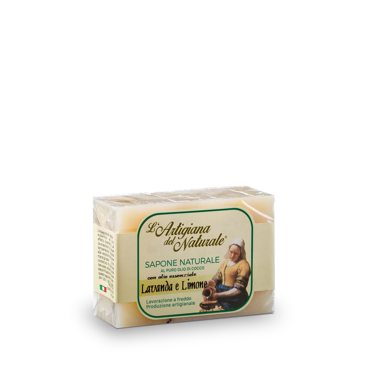 Sapone artigianale a base di olio di cocco con olio extravergine di oliva, olio essenziale di lavanda, di limone, fiori di lavanda e bucce di limone.