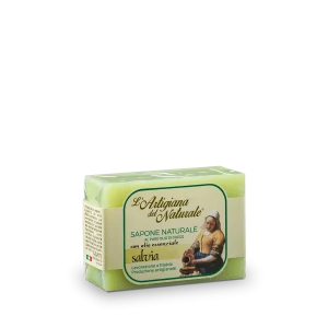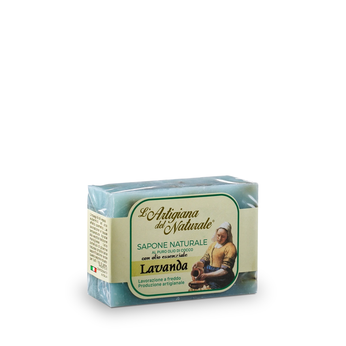 Sapone artigianale a base di olio di cocco con olio extravergine di oliva, olio essenziale e fiori di lavanda.