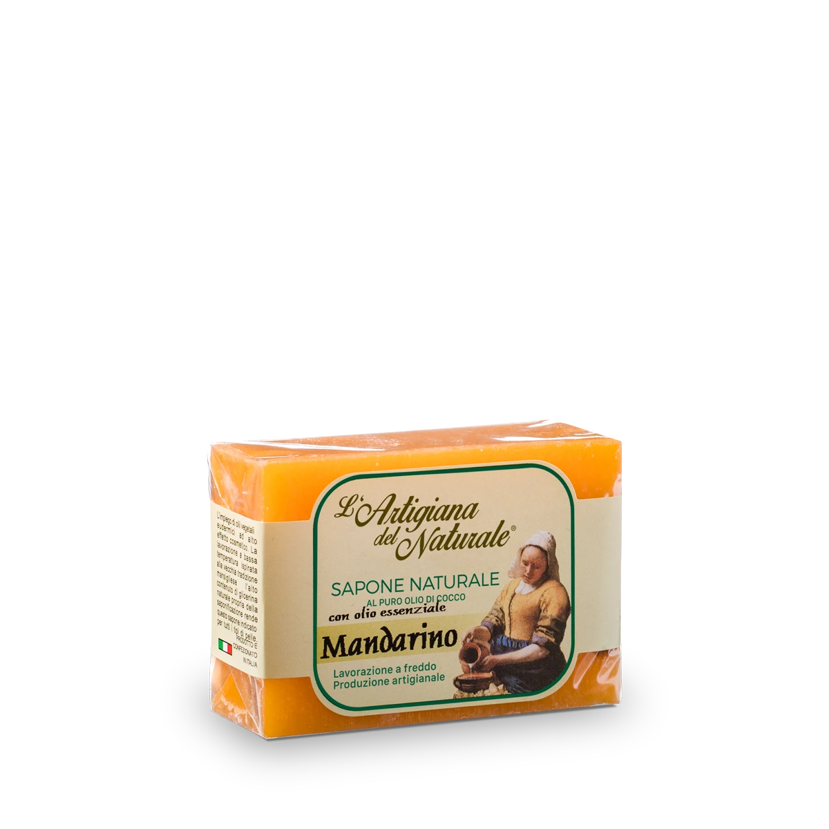 Sapone artigianale a base di olio di cocco con olio extravergine di oliva, olio essenziale e bucce di mandarino.