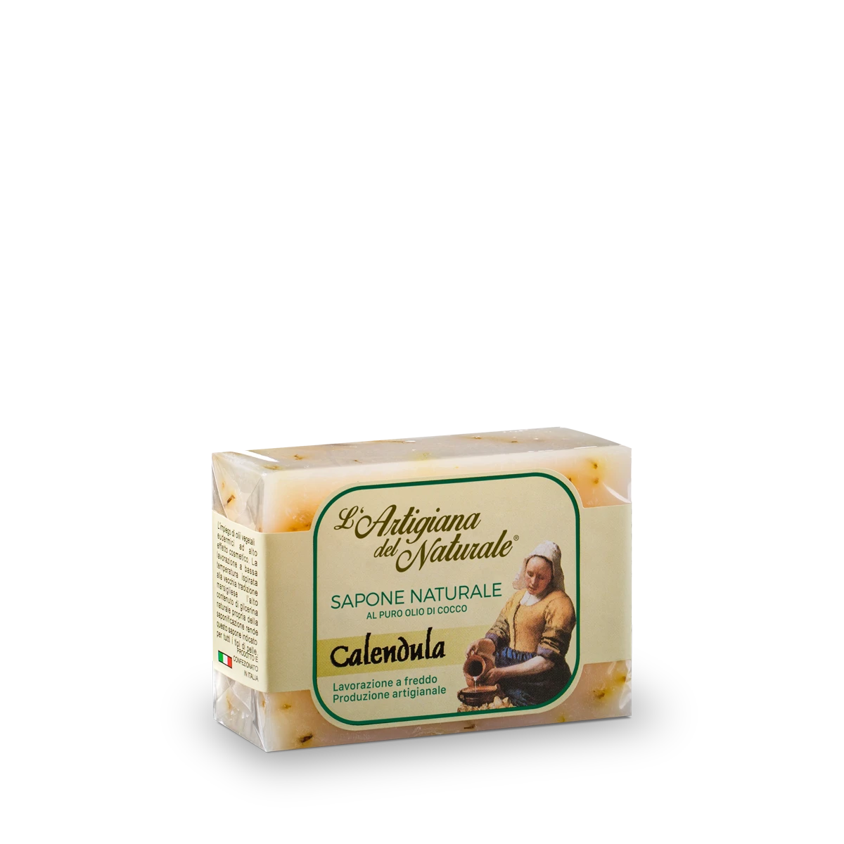 Sapone artigianale a base di olio di cocco con oleolito di calendula, olio extravergine di oliva e petali di calendula.