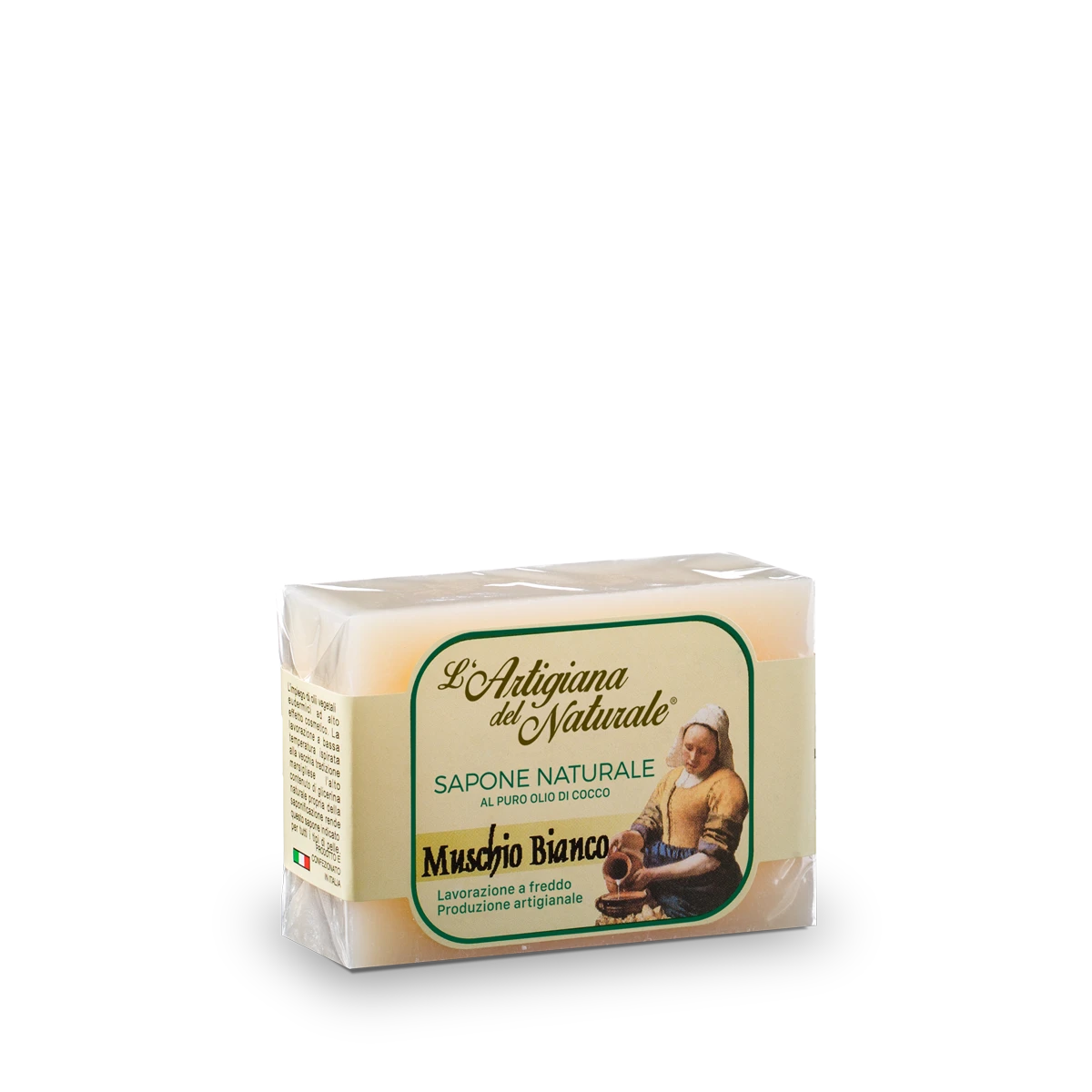 Sapone artigianale a base di olio di cocco con fragranza di muschio bianco.
