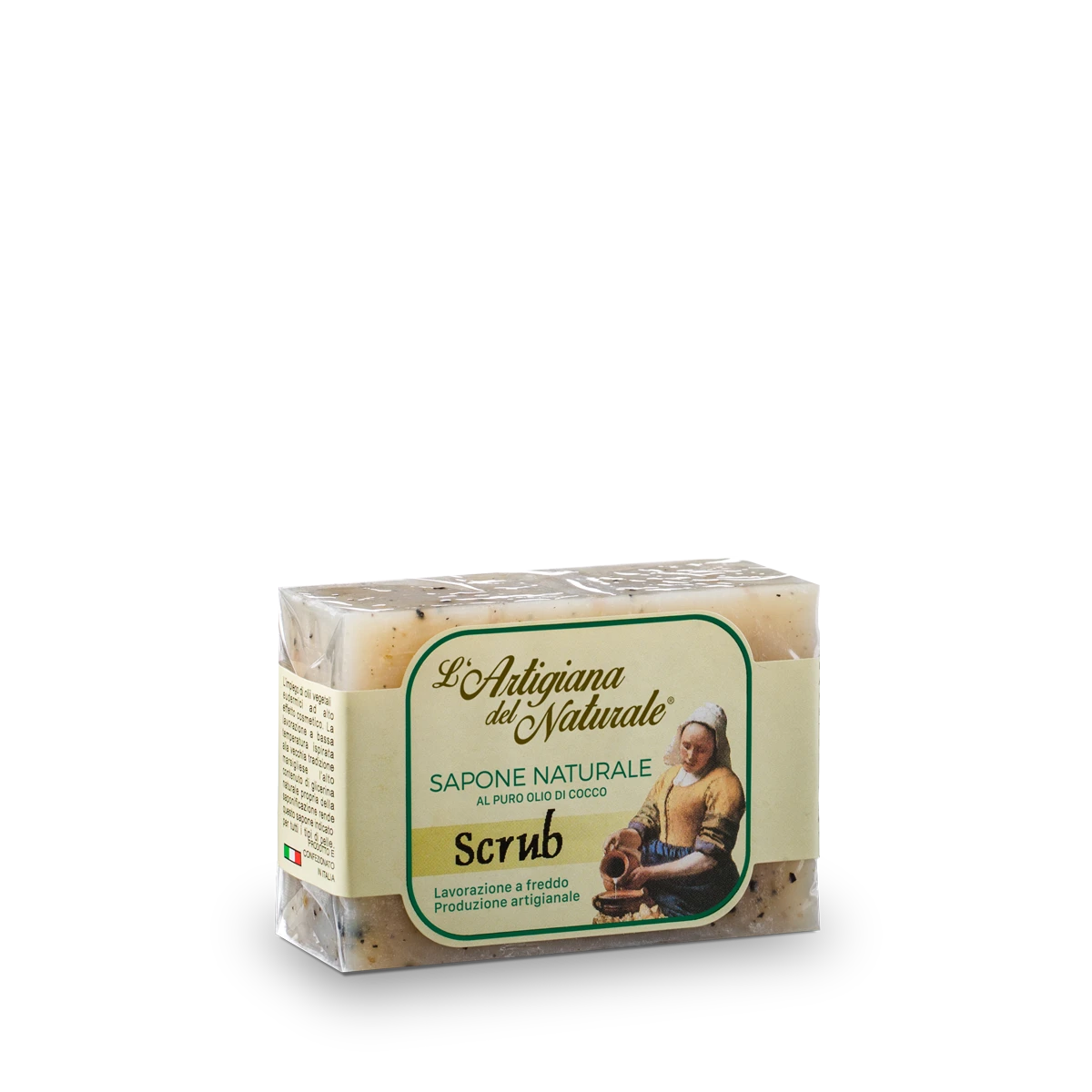 Sapone artigianale a base di olio di cocco con olio di riso, crusca, avena e alghe per un leggero effetto scrub sulla pelle.