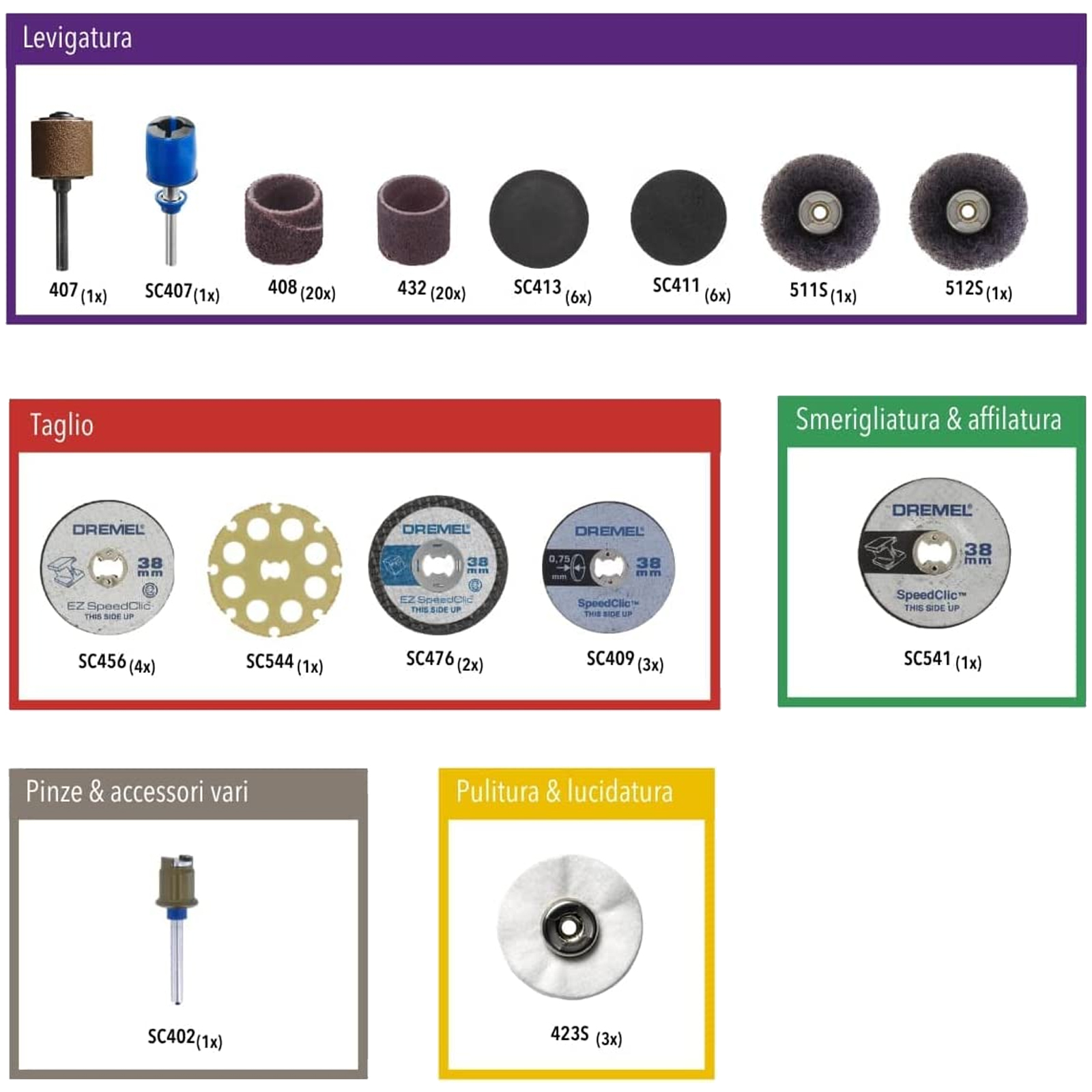 Con questo set di accessori è possibile affrontare una vasta gamma di applicazioni quali taglio, levigatura, smerigliatura, lucidatura per un’ampia varietà di materiali diversi.