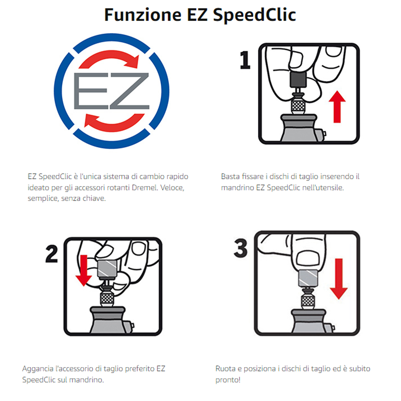EZ SpeedClic è lo straordinario sistema Dremel che consente di sostituire in modo rapido gli accessori multiutensile.