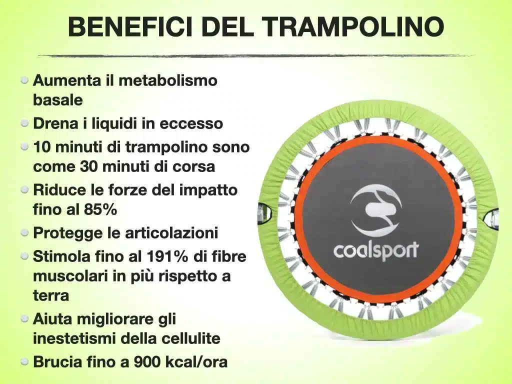 Totalmente premontato con sacca di trasporto. E’ stato scientificamente provato presso il gruppo ELAV che il metodo di Jill Cooper abbinato al tappeto elastico modificato di Coal Sport può aumentare il metabolismo fino a 14% in più in rispetto di un lavoro a terra.